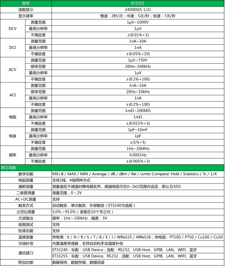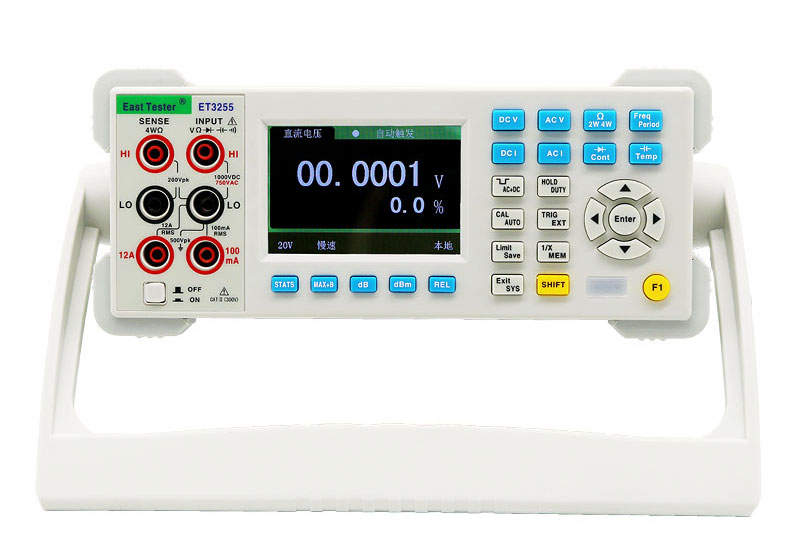 ET3255为功能全面、性能稳定的真有效值数字万用表,本系列台式万用表提供强大功能,出色的性能,良好的用户体验;3.5寸TFT液晶屏显示、读数清晰、内容丰富,具有良好的显示效果。本表采用市供电驱动使之成为高可靠性数字台表。全功能、全量程过载保护和独特的外观设计使之成为电工以及高校实验室的首要之选。 产品特点: ● 采用3.5寸TFT液晶屏显示(分辨率320*480),屏幕亮度可调 ● 中英文语言切换 ● 双参数显示,可显示同一输入信号的两项参数(例如交流电压测量下可同时显示交流电压值和交流频率值) ● 超量程显示:量程的120% ● 测量显示速度可调,分快、中、慢三种; ● 交直流电压、交直流电流、2线/4线电阻测量 ● 直流电流大12A,直流电压大1100V ● 周期、频率测量,频率高值20MHz ● 电容测量,大值10mF ● 真有效值交流电压和交流电流测量,频宽可达100kHz ● 提供自动、外部、单次触发三种触发测量方式 ● 具有AC DC测量 ● 可选择手动或自动量程 ● 具有方波输出和占空比测量功能 ● 设置功能:语言、蜂鸣器、屏幕亮度等可设 ● 12种数学功能:MX B、MAX、MIN、Average、dB、dBm、REL、Hold、%、限值比较、统计、倒数 ● 具有外部校准功能,支持用户自行校准 ● 支持多种传感器:热电偶10种、热电阻4种 ● 支持自定义传感器 ● 图形显示:实时曲线、直方图、条形图等 ● 具有读数保持功能 ● 支持SCPI协议,提供编程文档 ● 数据内存存储功能和读取功能,方便查看数据信息 ● 多种通讯方式:RS232、USB Device、GPIB、USB Host、LAN、WIFI、蓝牙 ● 内置温度传感器进行冷端补偿,支持自动、手动补偿 技术指标: