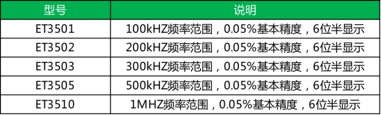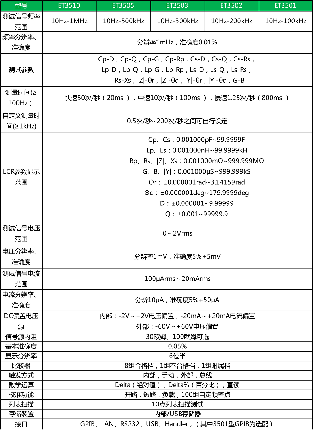 ET35系列LCR数字电桥是采用自动平衡电桥原理设计的高精度元件参数分析仪,其10Hz~1MHz的测试带宽、频率连续可调、0.05%的基本测量精度以及仪器所提供的自动电平控制功能、列表扫描和档计数功能为绝大多数元器件和材料提供准确、完整的测量与分析,广泛适用于产品研发、元器件入厂检验、产品在线分检等应用场合。 型号说明: