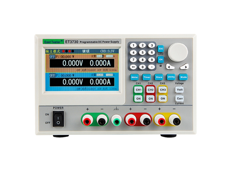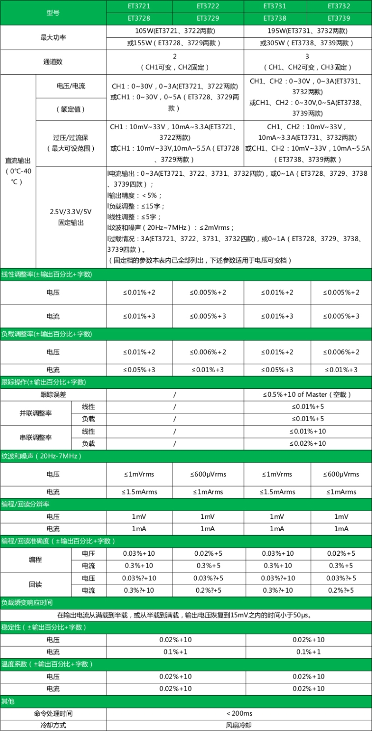 线性直流电源因其输出电压高稳定、低噪声的特点,广泛应用于研发测试和设计验证等场景。ET37系列可编程线性直流电源配备4.3寸TFT真彩屏,显示界面直观简洁、内容丰富,操作简单便捷;具有输出稳定、低噪声、高精度、高分辨率等特点;4种输出模式,输出范围大。 产品特点: 人性化设计 ● 采用4.3寸TFT液晶显示屏; ● 支持波形显示,实时显示通道输出电压、电流变化曲线; ● 操作系统简单便捷,配合直观的界面显示系统,上手容易; 高性能输出 ● 独立可调输出:1路(ET372X)/2路(ET373X)可调输出30V/3A(30V/5A),1路2.5V/3.3V/5V档位可调固定输出;大输出总功率可达305W; ● 四种输出模式:立/正负/并联/串联,提供更大的输出范围,大输出电压可达60V,大输出电流可达10A; ● 高精度,高分辨率; ● 低输出纹波和噪声; ● 具有优异的负载调节率和线性调节率; ● 支持定时输出功能,大可设置112组; ● 具有存储和调用功能,多可保存10组参数设置值; ● 标配USB Device接口,选配RS232接口,支持SCPI远程命令控制; 多重安全保护 ● 具有过压/过流保护功能,可以灵活设置过压和过流参数,对负载实现有效保护; ● 具有二级过温保护功能,实现软件和硬件的双重过温保护; ● 具有智能风扇控速功能,工作时根据工作条件调节风扇转速,有效降低工作时的风扇噪声; ● 具有输出极性接反保护 ● 具有按键锁功能,防止误操作。 技术指标: