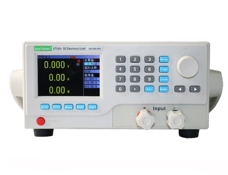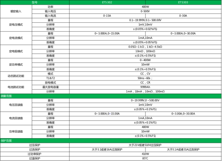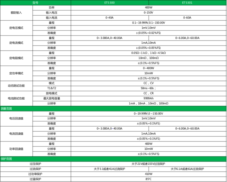 ET53系列单/双通道可编程直流电子负载,采用高性能芯片,高速,高精度设计,提供1mV、1mA的解析度,性能优越,可广泛运用于充电器,开关电源,线性电源,各类电池等行业的生产线测试,科研机构等试验研发领域。 产品特点: 人性化设计: ● 采用3.5寸TFT液晶显示屏,显示内容丰富,支持中英文显示; ● 操作过程简单便捷,配合直观的界面显示系统,上手容易; ● 具有按键锁功能,防止误操作; 高性能负载: ● 提供CC、CV、CR、CP以及CC CV、CR CV几种基本测量模式; ● 提供电池测试和LED测试; ● 动态测试模式,可测试电源动态输出性能; ● 扫描测试模式,可在一定范围内测试电源输出连续性; ● 支持远端测量; ● 列表模式,可模拟多种带载状态变化; ● 短路测试,用于模拟负载短路; ● 支持外部触发输入; ● 内置蜂鸣器报警; ● 断电保持数据存储功能; ● 可通过USB、RS-232接口进行远程操作; 多重安全保护: ● 具有过压、过流、过功率、过温保护功能,可以灵活设置过压和过流参数,对负载实现有效保护; ● 具有智能风扇控速功能,有效降低工作时的风扇噪声; ● 具有输入极性接反提示; 技术指标: ET5300/ET5301