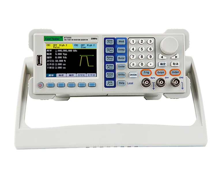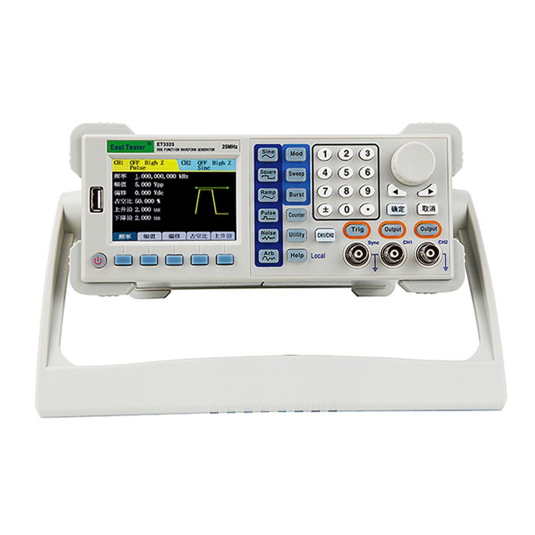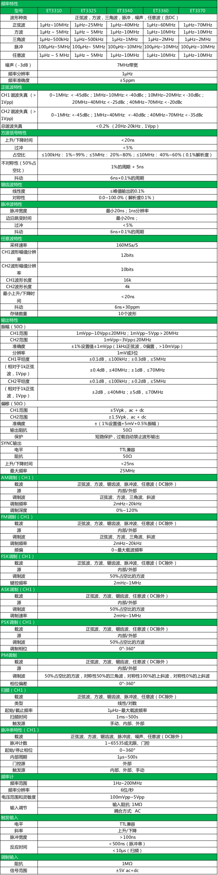 产品特点: ● 采用3.5寸480x320TFT液晶屏,具有清晰的图形化界面 ● 支持中英文菜单 ● 按键帮助,方便获取信息 ● 文件管理,支持U盘和本地存储 ● 双通道输出,高输出频率:ET3310为10MHz、3325为25MHz、3340为40MHz、3360为60MHz、3370为 70MHz ● 双通道之间相互独立,具有相位同步功能 ● 160MSa/S采样率,12位垂直分辨率,16k存储深度 ● 内置5种基本波形和60种任意波形 ● 波形存储:支持10组用户自定义编辑的波形 ● 边沿时间可设的脉冲波输出 ● 内部/外部AM、FM、FSK、PM、ASK、PSK调制功能 ● 线性/对数扫频和脉冲串波形的输出 ● 带200MHz高精度频率计 ● 具备RS232接口、USB Device、USB Host接口,GPIB(选配),支持U盘存储 ● 配备多功能任意波形编辑软件 技术指标: