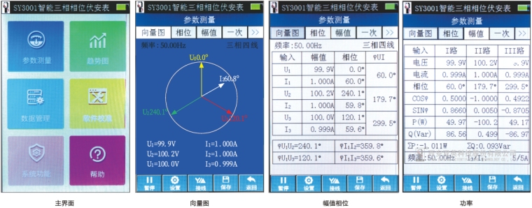 测量范围:0-500V、0-10A,精度:电压0.2级,电流0.5级,相位:±1.0°,测相范围:电流5mA-10A、电压3V-500V 幅值测量误差: