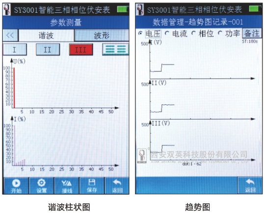 SY3001D除配小型高精度电流钳3把外,增配备1把50mm大钳口高精度10A测试钳,可用于较粗导线的漏电流及相位测量。 一、主要功能及特点 1、3路电压、3路电流全部互相隔离,支持三相四线和三相三线接线方式; 2、真彩色TFT显示,触摸屏操作,可实时同屏显示电压和电流真有效值、相位、频率、功率、功率因数等电参数,测量结果以向量图、幅值、相位、一次等多种方式显示; 3、可实时显示三相电压、电流波形,相位测量为基波相位,抗干扰能力强; 4、可显示三相电压、电流基波幅值、2~50次谐波含有率和柱状图,具有电能质量分析功能; 5、支持2G以上大容量TF卡存储,可以存储数据和趋势图,数据方便导入Excel; 6、支持软件校准,内部无硬件校准,稳定度好,年变差小; 7、配有蓝牙和USB接口,可以连接安卓手机,利用联机APP扩充更多功能: 1)可实现对复杂的现场测量或调试进行多样化远程技术指导(通过APP、QQ、微信等实时方式分享测量结果); 2)可对每一个现场的测量数据、工作环境及工作人员等情况进行详细的记录,试验结果按自定义模板导出为word文件; 3)保存时生成地理位置信息,可以添加现场照片、可以添加文字备注等; 4)带负荷测试时也可直接生成word报告; 5)可以选配蓝牙打印机利用APP现场打印。 二、测量显示界面(SY3001系列界面相同) 每次测量得到的数据或保存在记录中的测量结果都可以按照向量图、相位、幅值、一次侧、谐波、判别结果、备注等不同方式来显示其中的信息,用户可以根据自己的需要进行选择查看