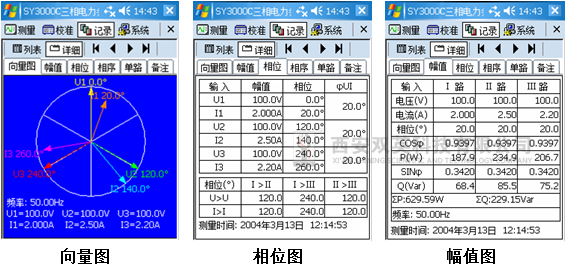 SY3000C-II智能三相电力参数测试仪掌上电脑、笔记本电脑同时拥有,蓝牙技术远距离操作,测量主机与掌上电脑或笔记本之间无接线束缚。小电流测相突破1mA,解决轻负荷小电流测相难的高精度智能化测试仪表。完全图形化界面,真彩色显示,触摸屏操作,汉字手写输入,人机界面友好,软件终身免费远程升级。仪表手持式结构、精巧美观、测量精准、操作简单、安全可靠,是电力系统电能计量和继电保护专业,进行二次回路现场检测的智能化仪表。也广泛适用于电气设备制造、石油化工、钢铁冶金、铁路电气化、科研教学等部门。 一、功能特点 1.可在不断开被测电路的情况下同时测量1-3路交流电压、1-3路交流电流的幅值及其各量间的相位,测量单/三相功率和功率因数,测量频率等电参数; 2.六输入量全部隔离,支持任意接线方式,三路电压不共地,每路都可以进行任意两点的电压测量,可以进行互感器初次级之间电压相位测量,进而判断互感器极性,测相时可以以任意输入为基准,测量任意信号间相位; 3.高亮度真彩色TFT屏幕,向量图、表格、分通道等多种显示方式,同屏可显示20多个电参数,测量数据一目了然;彩色向量图细腻清晰,图中可以在每个向量上同时显示幅值和角度等多种信息; 4.蓝牙技术,测量主机与掌上电脑或笔记本之间无接线束缚,实现远距离操作; 5.支持PT、CT变比设置,可以根据设置计算显示一次侧值; 6.电压、电流真有效值原理测量,不受波形失真影响,自动量程,设置合理; 7.向量图绘制可以设置正方向为顺时针或逆时针;可以设置0度角方向为十二点或三点钟方向,基准量角度为330°或0°,可以设置下表类型和电流电压半径比,符合各种用户习惯; 8.现场保存数据,自动记录测量时间、操作人员等信息,可随时加入对测量结果的汉字备注,测量数据无限存储; 9.具有USB接口,测量数据可上传到计算机,进行浏览、导出、编辑、打印(A4幅面)、备份、恢复等,可导出生成带有表格和向量图的标准网页格式文件和试验报告; 10.支持用户软件校准; 11.新型小型高精度电流钳; 12.超低功耗,采用2节5号充电电池工作;也可使用2节5号干电池工作;亦可使用电源适配器外接220V交流电源工作及充电;电池更换方便; 13.软件终身免费远程升级,SD卡扩充存储,多媒体播放,多种应用程序下载安装,系统功能可随软件升级扩展; 14.配有带蓝牙功能及产品测试软件的笔记本一台。 二、用途 该仪器是电力系统电能计量和继电保护专业,进行二次回路现场检测的新一代仪表。也广泛适用于电气设备制造、石油化工、钢铁冶金、铁路电气化、科研教学等部门,具有以下用途: 1. 检测继电保护各组CT之间相位关系; 2. 检查电度表接线正确与否; 3. 判断电度表运行快慢,合理收缴电费; 4. 感性和容性电路的判别; 5. 检查变压器接线组别; 6. 电气设备生产中对电流电压相位的测量; 7.由于精度高,可以测量漏电流及零序电流等。 三、主要显示界面