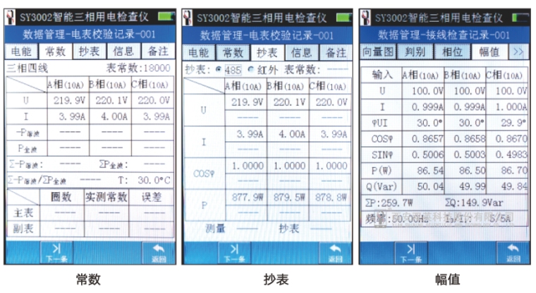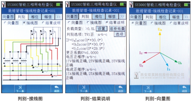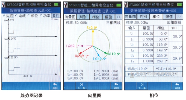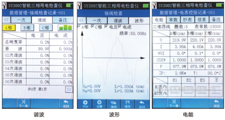 一、主要功能及特点 1. SY3002智能三相用电检查仪具有6路输入(3路电压、3路电流),支持三相四线和三相三线接线方式。 2. 真彩色TFT显示,触摸屏操作,可实时同屏显示电压和电流真有效值、相位、频率、功率、功率因数等电参数,测量结果以向量图、幅值、相位、一次等多种方式显示。 3. 数字信号处理技术,抗干扰能力强,测量得到RMS真有效值和基波相位值,快速准确,可用于波形失真严重的现场环境。 4. 可显示三相电压、电流基波幅值、2~50次谐波含有率和柱状图,具有电能质量分析功能;可实时显示三相电压、电流波形。 5. 可根据用户不同负载类型实时进行三相三线制192种和三相四线2304种接线错误判定,可直接显示功率表达式和错误接线图,并进行追补电量计算。 6. 具有光电脉冲输入输出接口(两个输入,一个输出),具备三相电能表误差校验和常数校核功能,支持主副表同时校准。 7. 具有485和红外接口,可进行电能表抄表,读取电能表内部测量结果。 8. 具有仪表内部温度测量功能。 9. 支持2G以上大容量TF卡存储,可以存储接线检查、电表校验和趋势图,数据方便导入Excel。 10. 可选配500A、1500A等电流钳,测量CT变比。 11. 支持软件校准,内部无硬件校准,稳定度好,年变差小。 12.配有蓝牙和USB接口,可以连接安卓手机,利用联机APP扩充更多功能: 1)可实现对复杂的现场测量或调试进行多样化远程技术指导(通过APP、QQ、微信等实时方式分享测量结果); 2)可对每一个现场的测量数据、工作环境及工作人员等情况进行详细的记录,试验结果按自定义模板导出为word文件; 3)保存时生成地理位置信息,可以添加现场照片、可以添加文字备注等; 4)带负荷测试时也可直接生成word报告; 5)可以选配蓝牙打印机利用APP现场打印。 二、测量显示界面 每次测量得到的数据或保存在记录中的测量结果都可以按照向量图、相位、幅值、一次侧、谐波、判别结果、备注等不同方式来显示其中的信息,用户可以根据自己的需要进行选择查看