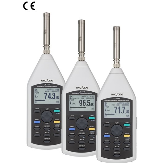 3种等效噪音级噪声计「LA-1411/LA-1441 (Class 2、普通声级计)」及「LA-4441(Class 1、精密声级计)」,均符合国际电工标准IEC 61672-1:2002、日本工业规格JIS C 1509-1:2005及日本计量法(2015年实施),具有很宽的线性范围即100dB而且不需要切换可适应大小不同的噪声变动,可同时测量、显示,包括等效噪音级噪声在内的7种噪声指标。而且,噪声计的传声器与本体部分分开,用专用的同轴电线,远距离进行测量。由于筐体采用曲面形状,减少了声音反射的影响,而且操作菜单直观明了,实现了更好的人机界面。另外,使用专用的软件,通过RS-232C或USB,能将测得的数据方便地由电脑遥控操作噪声计。