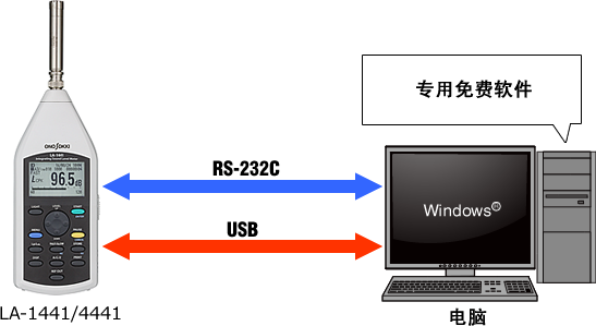 噪声计本身可用RS-232C 或 USB电线与Windows电脑连接,使用专用的免费软件,可将测得的数据,又快又好地传送到电脑,或者由电脑对噪声计进行遥控操作。(不包括LA-1411)
