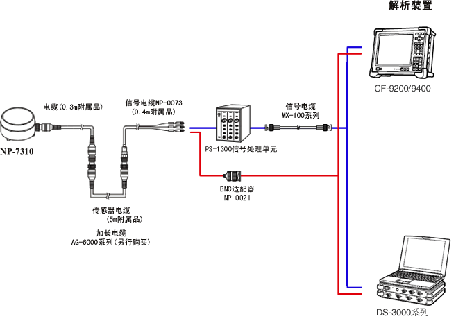 NP-7310 可以与PS-601/602 等传感放大器等组合起来配套使用,也可以与 FFT 频谱分析仪 DS-2000/DS-3000 系列、CF-9000 系列等可提供恒电流电源的分析仪或记录器直接从输入端接入进行使用。