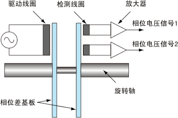 上图所示,旋转轴上的相位差基板的两端设置有驱动线圈与检测线圈,驱动线圈产生的磁场信号通过相位差基板,由检测线圈产生出相应磁场的电压信号。旋转轴上加有扭矩时,旋转轴将发生一定的扭曲,根据扭曲角的变化,2个检测线圈的磁场间会产生相应的磁场相位差,将2个检测线圈的磁场的电压信号进行放大,送至TS-2800,根据磁场相位差信号计算出扭矩值。