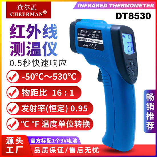 技术指标 | 测量温度范围 | -50℃~530℃ (-58℉~986℉) | 测温精度 | ≥100℃ ±2%,≤100℃ ±2℃ | 测量距离比率 | 16 : 1 | 发射率 | 0.95 | 响应时间和响应波长 | 500ms & 8-14μm | 重复性 | ±1% 或 ±1℃ | 解析度 | 0.1℃ 或 0.1℉ | 储存环境温度 | -20℃~50℃(-4℉~122℉) | 操作温度 | 0℃~50℃(32℉~122℉) | 摄氏度℃/华氏度℉转换 | √ | 数据保持 | √ | 镭射目标显示选择功能 | √ | 背光显示选择开启/关闭 | √ | 低电量显示 | √ | 自动关机 | √ | 一般特征 | 供电 | 9伏电池 | 产品颜色 | 黑色+黄色,蓝色+黑色 | 包装 | 每箱数量 | 按实际订单数量 | 外箱尺寸 | 按实际纸箱规格 | 外箱毛重 | 按实际货品毛重 |
