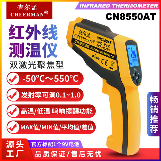技术指标 | 测量温度范围 | -50℃~580℃ -58℉~1076℉ | 测温精度 | ≥100℃ ±2%,≤100℃ ±2℃ | 测量距离比率 | 12 : 1 | 发射率(可调节) | 0.1~1.0 | 响应时间和响应波长 | 500ms & 8-14μm | 重复性 | ±1% 或 ±1℃ | 解析度 | 0.1℃ 或 0.1℉ | 储存环境温度 | -20℃~50℃(-4℉~122℉) | 操作温度 | 0℃~50℃(32℉~122℉) | 测量最大值/最小值/平均值/差值 | √ | 高温/低温报警设置 | √ | 摄氏度℃/华氏度℉转换 | √ | 数据保持 | √ | 镭射目标显示选择功能 | 双激光 | 背光显示选择开启/关闭 | √ | 低电量显示 | √ | 自动关机 | √ | 一般特征 | 供电 | 9伏电池 | 产品颜色 | 咖啡色+黄色,深灰色+黄色 | 包装 | 每箱数量 | 按实际订单数量 | 外箱尺寸 | 按实际纸箱规格 | 外箱毛重 | 按实际货品毛重 |