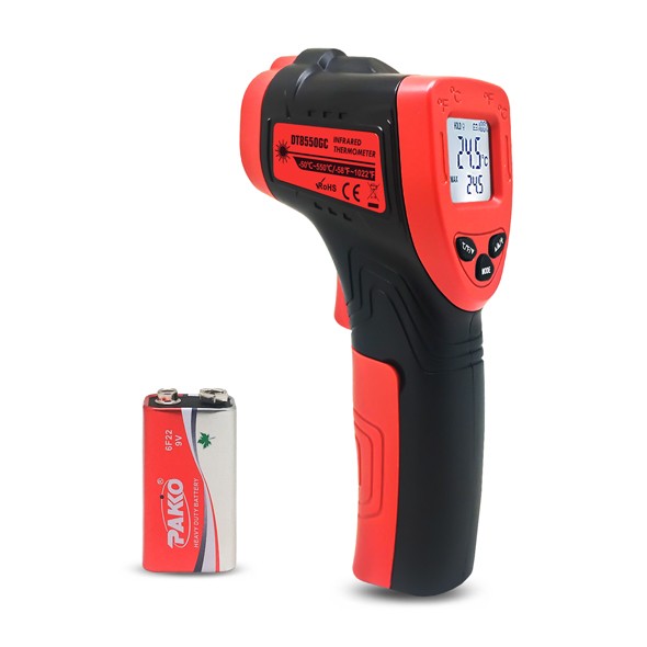 技术指标 | 测量温度范围 | -50℃~550℃ -58℉~1022℉ | 测温精度 | ≥100℃ ±2%,≤100℃ ±2℃ | 测量距离比率 | 12 : 1 | 发射率(可调节) | 0.1~1.0 | 响应时间和响应波长 | 500ms & 8-14μm | 重复性 | ±1% 或 ±1℃ | 解析度 | 0.1℃ 或 0.1℉ | 储存环境温度 | -20℃~50℃(-4℉~122℉) | 操作温度 | 0℃~50℃(32℉~122℉) | 电池电量百分比显示: 0%~100% | √ | 所测温度最大值MAX 显示 | √ | 摄氏度℃/华氏度℉转换 | √ | 数据保持 | √ | 镭射目标显示选择功能 | √ | 背光显示选择开启/关闭 | √ | 低电量显示 | √ | 自动关机 | √ | 一般特征 | 供电 | 9伏电池 | 产品颜色 | 黑色+红色,黑色+黄色 | 包装 | 每箱数量 | 按实际订单数量 | 外箱尺寸 | 按实际纸箱规格 | 外箱毛重 | 按实际货品毛重 |