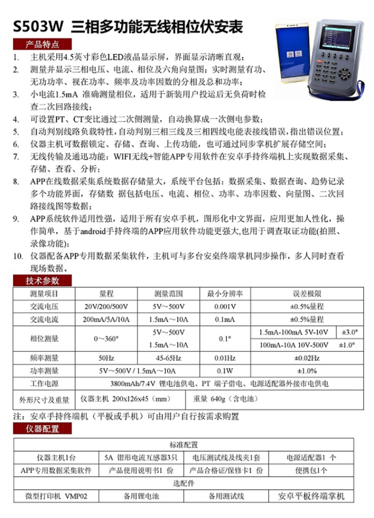 无线三相相位伏安表S503W
