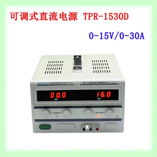 TPR-1530D: 0-15V/0-30A 应用范围: 1. 用于教学实验,科研 2. 用于电子生产线的产品的测试与老化 3. 用于通讯设备的维修 4. 其他需要直流稳压电源的领域 技术参数 输出电压:AC220V±10% 50Hz (可根据要求订做AC110V±10% 60Hz ) 工作温度:-10℃-40℃ 相对湿度<80% 储存温度:-10℃-70℃ 相对湿度<70% 稳压状态: 电压稳定度≤ 0.05%+2mV 负载稳定度≤ 0.7%+2mV 恢复时间≤100us 纹波噪声≤5mVrms (有效值) 温度系数≤300PPM/℃ 稳流状态: 电流稳定度≤ 0.5%+3mA 负载稳定度≤ 0.75%+3mA 纹波波噪音≤ 7mArms(有效值) 电压显示精度:三位LED数字显示 ±1%±1个字 电流显示精度:三位LED数字显示 ±1%±1个字