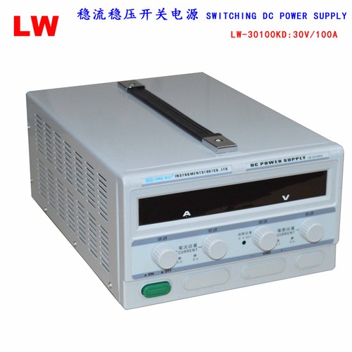 LW30100KD: 0-30V/0-100A 特点: 1. 高精度LED数字显示,直观明了。 2. 12公分智能化的温控风扇,散热效果优良,有效延长风扇寿命,降低噪音。 3. 采用先进技术,有效减轻了电源的重量,方便电源移动。 4. 多种保护功能,过压保护(OVP),限流保护(OCP),过温保护(OTP),过功率保护(OPP)。 5. 塑胶面板,更美观,提手设计,更方便携带。 应用领域: 1. 蓄电池充电。 2. 车载DVD,车载音响。 3. 产品老化,如电阻,电容,继电器,直流马达等。 4. 电解、电镀、PCB制造业。 5. 实验室,工厂,维修用电源。 6. 其它一切需要直流稳压电源的场合。 技术参数: 1. 输入电压:220V±10% @50Hz±5Hz(110V±10% 60Hz±5Hz可定做) 2. 输出电压:DC 0-额定值V (见表四) 3. 输出电流:DC 0-额定值A (见表四) 4. 显示精度:±1%±1字,电压分辨率0.1V,电流分辨率0.1A) 5. 开机延迟:3-5S 关机延迟:1-10S(视负载而定) 6. 电压稳定度:≤0.2% 7. 电流稳定度:≤0.5% 8. 负载稳定度:≤0.5% 9. 纹波及噪声:≤1%(有效值) 10. 整机效率:≥86%(满载情况下测试) 11. 工作环境:-10℃- +40℃ 相对湿度20%-90%(非凝结) 12. 存储环境:-20℃- +80℃ 相对湿度20%-80%(非凝结) 13. 耐压测试: 输入-输出:1.5KVAC/1分钟 输入-外壳:1.5KVAC/1分钟 输出-外壳:500VAC/1分钟 14. 接地电阻:<20mΩ 15. 外观尺寸:长440mm*宽260mm*高160mm(不包括突出部分)