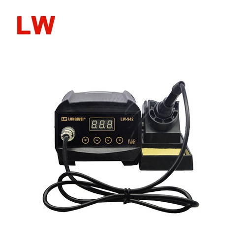 LW-942 智能无铅焊台/数显焊台 应用范围: 1.工业生产进行电子产品装配 2.科研部门进行产品开发 3.维修行业进行电子产品检修 4.各企事业单位电工进行锡焊操作 5.电子技术爱好者进行电子装配 6.各类院校电 特点: Ø 三位一体高亮数码显示,精确的温度控制。温度控制范围200℃~450℃,精度±2℃。 Ø 智能化MCU程序控制,带自动休眠模式和智能唤醒,优良的操作性能。超强之功率补偿速度,焊接温差小,特别适合于恒温焊接的无铅制程。 Ø 75W的足功率,从室温到350℃所需要时间小于10秒。 Ø 智能锁定装置控制,可免除操作人员随意变动焊接温度值。 Ø 智能式焊咀温度校准功能,能迅速校准焊咀温度。 Ø 故障自诊,当焊咀温度低于设定值或由于机芯,发热体传感器等到发生故障时,焊台即会报警发出提示并停止加热,安全可靠。 Ø 人性化手柄设计和短距离操作焊咀,适合长时间和灵活操作。 Ø 接插式焊咀,更换快捷方便,低压24V焊咀发热芯及整机之防静电设计,能保证敏感元件的焊接安全。