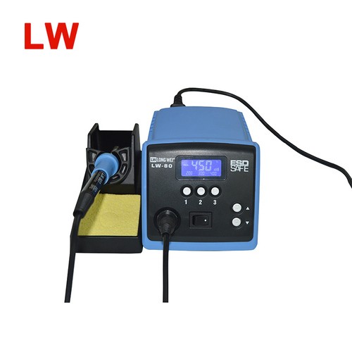 无铅防静电高端智能电焊台系列 LW-60/80/100 概述: 研发技术中心,创客中心的工程师产品 适用于个人消费电子,小家电行业PCB的焊接拆焊 广泛应用于大中型,品牌化企业生产作业 适用于高等院校的教育教学 功能特点: l 大屏 LCD 带背光液晶显示,多种参数设定,实现可视化人机互动操作 l 菜单式操作,三组快捷温度存取键,实现常用温度快速切换。 l 休眠功能,自动待机、关机功能,保护用户安全,延长产品使高寿命 l 温度锁定功能,实现产品使用权限设置,便于工艺管控。 l 功率消耗模拟条功能,实现显示工作状态功率消耗情况。 l 快速智能温度补偿功能,实现产品工作状态的温度恒定。 l 软件校温控温功能,产品长期使用仍能与出厂时保持一致。 l 低压发热体,完全隔离电网,保证焊接安全 l 采用900M系列进口高档洛铁头,与发热芯分体式设计,有效降低耗材更换成本。 l 烙铁座和主机分离设计,节省空间,摆放容易。 l 采用纯铜线变压器保证足够功率输出,可满足大功率输出长时间工作 l 使用温度可在摄氏度(℃)与华氏度(℉)任意切换