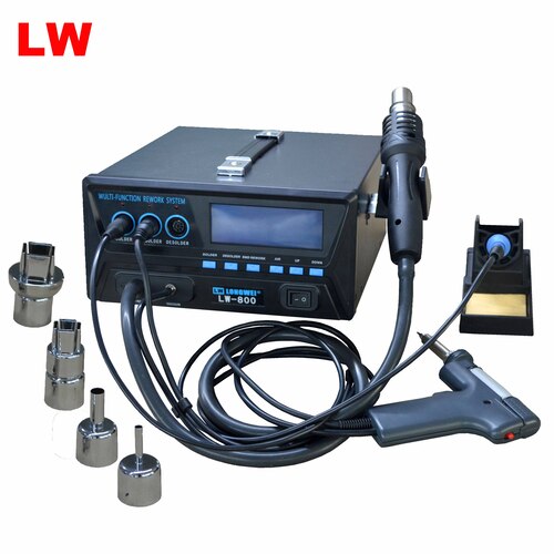 无铅防静电焊接拆焊吸锡三合一高级维修系统LW-800 应用范围 l 工业生产进行电子产品装配 l 科研部门进行产品开发 l 各企事业单位电工进行焊锡操作 l 教学实训 l 维修行业进行电子产品检修 l 单子技术爱好者进行电子装配 功能特点 l 采用高精度MCU控制,同步检测3个工具通道,可独立使用,同步操作,互不干扰。 l 使用高清LCD带背光大液晶屏,可视化的过程控制,便于使用者操作。 l 软件自动校温,更精确,更方面。 l 具有故障显示报警功能。 l 产品带有休眠,蜂鸣讯响及温度锁定、恢复出厂设置等功能。 电焊台 n 焊台采用银合金导热材料,热传导方式,极高的回温速度,开机从室温升至350℃仅需要10秒。 n 烙铁头与发热芯分体设计,节约使用成本。 n 传感器前置,控温精度高,温度稳定性好。 n 焊接手柄轻巧,使用舒适。 吸锡焊台 n 吸锡焊台发热芯采用36VAC低压电源和主电源是以变压器隔离输出,安全可靠。 n 内置真空泵,吸力强劲。 热风拆焊台 n 智能冷却系统,关机可自动延时送风,大大延长发热芯和手柄使用寿命。 n 采用螺旋式发热芯,使用寿命更长。 n 热风枪手柄部件重新设计,吹出的风量更加均匀,且不易损坏,便于维护和储运。