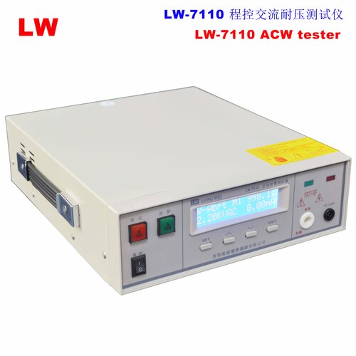 LW7110程控交流耐压试仪 性能特点: 超小体积,重量轻; 操作简单,键盘锁定功能; 提供5组记忆体设定,每组可选四种工作模式; LCD液晶显示,测试状态、结果一目了然; 电压按时间梯度上升,实时分析、寻找击穿点; 电流上下限设置,智能报警; 电弧侦测功能(1-9级); 提供远程PLC控制接口; 技 术 参 数 | 范 围 | 解析度 | 基 本 精 度 | 交流耐压特性 | 输 出 电 压 | 0 – 5.00(Kvac)/ 12(mA) | 0.01 | ±(2% of setting +5V) | 输出频率\波形 | 50 or 60 Hz, ±100 ppm, 正弦波, 失真度(THD)<� 2% | 电流上下限设定 | 0.10 – 12.009(mA) | 0.01 | ±(2% of setting +2 counts) | 上升时间,秒(s) | 0.1 – 999.9 (s) | 0.1 | ±(0.1% +0.05 counts ) | 测试时间,秒(s) | 0, 0.2 – 999.9 (s) (0 = 连续) | 0.1 | ±(0.1% +0.05 counts) | 电弧(Arc)侦测 | 9级(0 为关闭,1为灵敏) | 其他规格 | 记忆组(Memory) | 5组记忆, 4种测试模式: W,I,W – I,I - W | 外设遥控、PLC接口 | 提供Pass、Fail、Processing遥控监视信号和TEST、STOP接点 | 安全保护 | 过载或短路自动切断输出, 信号灯和蜂鸣报警 | 整机尺寸 | 280mm(W) × 89mm(H) × 320mm(D) / 10Kg |