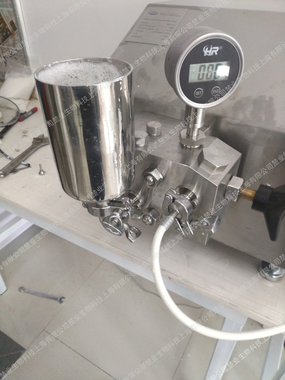 High Pressure Homogenizer Laboratory specific High PressureHomogenizer Cell disruption 型号:ME-H10 ME-H10 处理产品:菌体破碎(比如大肠杆菌),脂肪乳,脂质体,脂质纳米粒,纳米悬浮液,食品,化工产品等 产量:5~15升/小时 工作压力 :1500bar/22000psi 温度控制:可控温,标配热交换器 均质级数:一级或两级 进料颗粒尺寸:< 100微米 入料粒度:500um 成品:100nm 处理量:25ml 马达功率:2.2kW/380v/50hz 重量:约120kg 机器特点: 2.2kw的大功率电机,保证高压下稳定工作 动态调整喷射间隙,无均质盲区 高压通道孔径大,不易堵塞 预留二级均质阀接口,适于特殊物料的均质扩展 数显压力表,精确显示实时均质压力 超高压设计,工作压力可达1500bar/22000psi 物料残留少,特别适合原辅料昂贵的药剂类客户使用 所有接触物料管道均为医药级不锈钢材质 根据需要,可定制为220V供电 均质工艺可放大,适合工业化生产 |