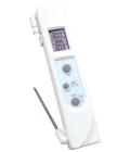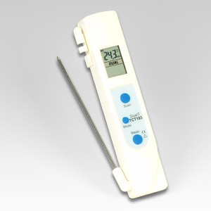 一般说明 红外测温仪,内置接触式热电偶探头. 双传感器温度计可以是非常有用的,一个非接触式和一个接触,温度测量是必需的. 专为食品行业应用设计. 防热冲击功能 IRT(红外测温仪)测温方便快捷. 当你把它从室外向室内(或从一个房间到另一个房间),你必须等待30分钟。“30分钟”**不是“瞬间”。大多数的IRT遭受这样的缺陷. 集多年的经验,在高精密临床红外测温仪(在EN12470内,由于每10℃ 热冲击的影响,温度变化偏差一定要小于0.2℃)传热的有限元分析; ZyTemp经克服这个障碍. 一个简单的测试,根据该测试方法描述的符合精度EN12470款7.6测试变化的环境条件下,清楚地表明很多同类产品的价格比TCT1高得多,这清楚显示ZyTemp TCT1在市场上的竞争优势. M模型中的错误达到 1.6°C和要求30分钟稳定,而TCT1是只有0.7°C和稳定在7分钟的. 类似试验可能很容易进行,即使你没有一个标准和稳定的黑体: 设置一个非常稳定的目标。提示:使用1大牛奶瓶子(2升),填写一瓶水,3个小时等待稳定,这是一个非常稳定的目标,热时间常数约100分钟 将IRT的放到户外1小时(例如15℃). 将IRT 拿回市内 (例如 25°C), 使用IRT每分钟测量一次那个瓶子的温度. 你会发现在30分钟内读数漂移,除非它是ZyTemp防热冲击的IRT:TCT102或TCT103. ThermaTwin 一般描述 ThermaTwin 的概述 ThermaTwin是用于温度测量的理想的多用途工具。它包含两个可靠的传感器: