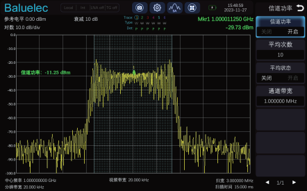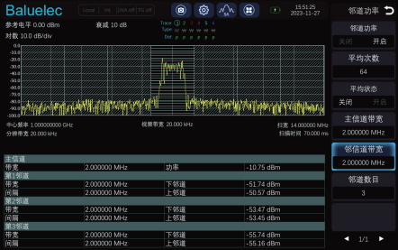 | 邻道功率测量 √.测量主信道功率值、前后邻近两信道功率值及其与主信道的功率差 |