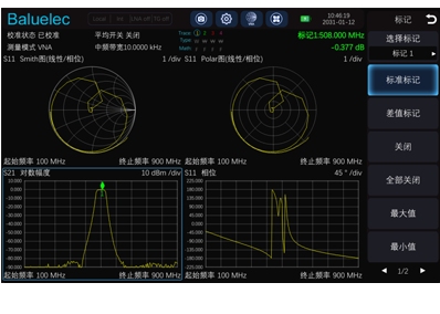 | 矢量网络分析仪 测量参数:S11、S21 多窗口测量 显示格式:回波损耗、插入损耗、驻波比、相位、群延迟、Smith图 |