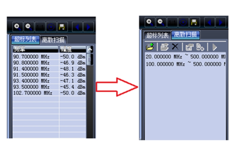 离散扫描 可以针对每一个离散频段进行特别设置, 包括起始、终止频率、步进/分辨率以及阈值, 为经常性的监视某些固定的离散频段的用户提供了方便。 |  |