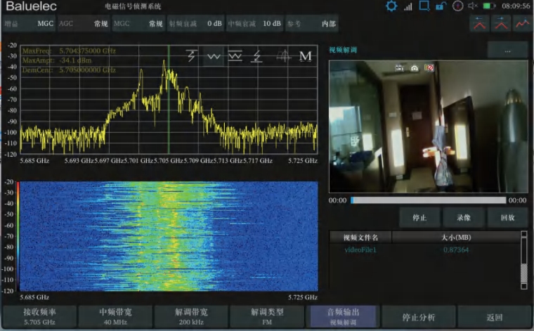 | 窃听窃视信号查找 近场空间的窃听和窃视信号通过与背景电磁频谱差分 获得初步信息,根据信号活动特征、功率大小、出现频次等 多方面进行信号的威胁等级判定,最终筛选出威胁程度最 高的六个信号。 | 摄像头视频解调 系统可以对常见的1.2G、2.4G和5.8G等针孔摄像头进行 探测和解调,图像输出分辨率480*320,制式包括NTSC、PAL 和SECAM;支持四幅影像的录制和回放。 |