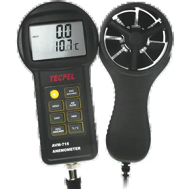 AVM-715 超大液晶显示器,双视窗显示,采用分离式感应器,易于操作测量且具有风速风量风温三种量测功能,提供更广的应用。 量测规范 - 量测单位 :风速:m/s、km/h、ft/min、knots、mile/h