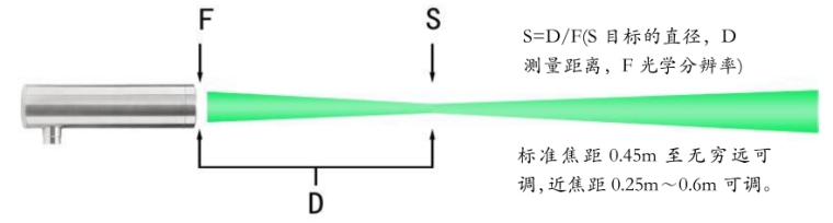 LED绿光源瞄准:采用可调焦镜头,光源的寿命长达10万小时。1:1指示出测量目标的大小。LED光源适用于近距离安装(如3m内)和非封闭环境中目标的检测。