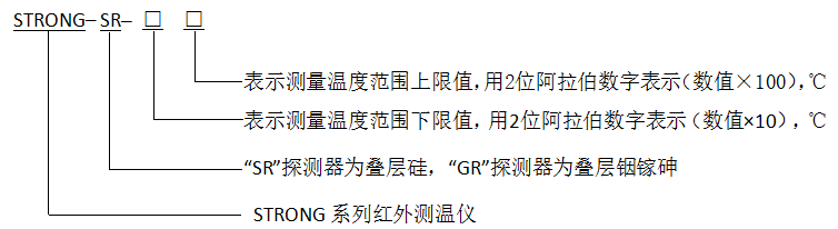 例如:STRONG-SR-6016表示测温范围为600℃~1600℃,采用叠层硅探测器的STRONG双色红外测温仪。STRONG-GR-3514表示测温范围350℃~1400℃,采用叠层铟镓砷探测器的STRONG双色红外测温仪。