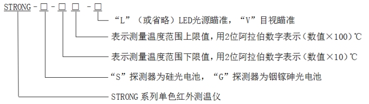 例如:STRONG-S-6016表示测温范围为600℃~1600℃,采用硅光电池探测器的STRONG单色红外测温仪。STRONG-G-3014表示测温范围为300℃~1400℃,采用铟镓砷探测器的STRONG单色红外测温仪。