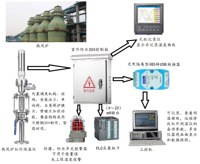热风炉是为高炉加热鼓风设备,是现代高炉不可缺少的重要组成部分。现代高炉多采用蓄热式热风炉,其工作原理是先燃烧煤气,用产生的烟气加热蓄热室的格子砖,再将鼓风站送来的冷风通过炽热的格子砖进行加热.。将热风炉轮流交替地进行燃烧和送风,使高炉连续获得高温热风。热风炉拱顶的温度,是安全、准确操作热风炉的重要数据。 传统热风炉温度的检测是通过热电偶来测量,采用铠装式双铂铑热电偶或其它热电偶,通过测量保温墙的温度,间接地控制热风温度。 热风炉耐火材料内衬在高温、高压环境下,工作条件十分恶劣。热电偶对使用环境的要求和本身结构的限制,在温度变化频繁压力波动大和振动的场合,造成了热电偶测温不准确、反应滞后,不能准确反应炉内温度的变化。 热电偶长期工作在高温区1200℃~1400℃,热电偶接线盒所处环境温度亦高达100~120℃,致使电偶的使用寿命很短,从几周到几个月不等。增加了使用成本和维护工作量。 为了克服上述缺点,设计出热风炉专用红外测温系统能很好地解决了以上问题,可确保红外测温系统在复杂的环境下可靠工作。 系统框图