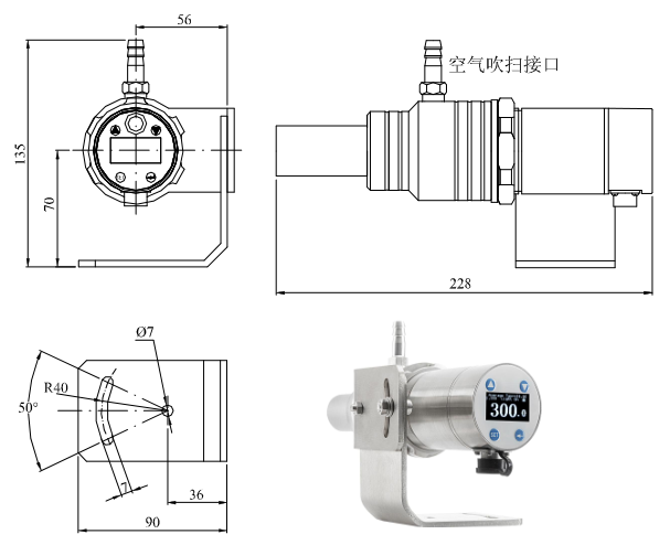 采用可调焦镜头,目视瞄准为正像,1:1指示出测量目标的大小,适用于超高温物体和封闭环境中以及远距离目标检测。 (2)MARS系列双角度调节支架加吹扫套