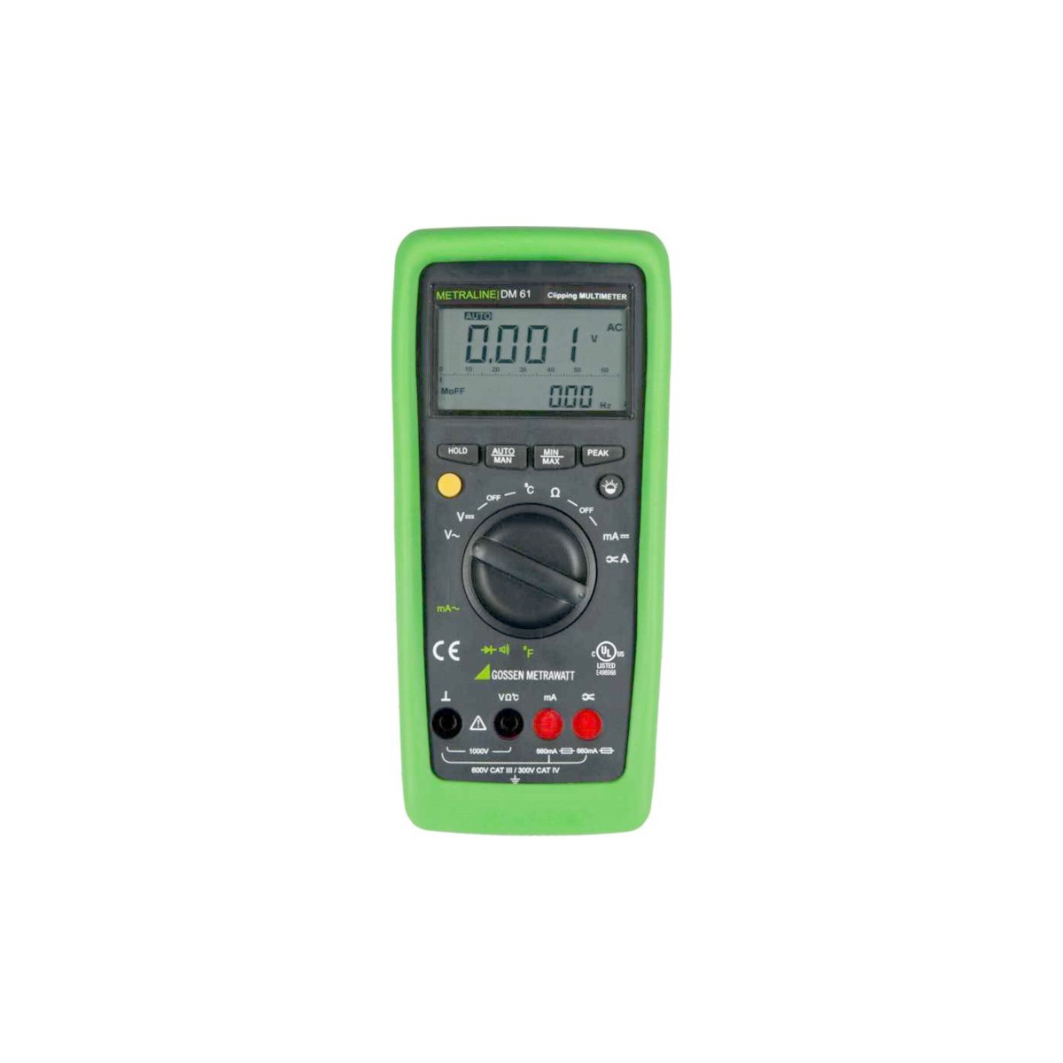 高性价比三位半手持多用表,可检测短路和中断导体,除了显示测试结果外,如果需要,还可以产生声学信号。 产品性能特点: • ABS 自动阻塞插座 自动阻塞插座防止测量电缆的不正确连接和不小心选择错误的测量。这大大减少了对用户、仪器和被测系统的危害。 • 自动/手动测量范围选择 用旋转开关选择测量。测量范围与测量值自动匹配。测量范围也可以通过自动/手动键切换 • 在模拟比例尺上显示负值 负值也显示在零频率量的模拟比例尺上,允许观察零点附近的测量波动。 • 测量值的存储 通过按住HOLD/min/max 键,可以在显示中“冻结”当前显示的测量值。选择最大/最小测试模式后,在仪器输入端出现的最大值最小值将保存下来。可用于测量的长期观测中最小或最大值的确定。min/max 功能对模拟显示没有影响;它继续显示当前的测量值。 • 连续性测试 可检测短路和中断导体.除了显示测试结果外,如果需要,还可以产生声学信号。 • 节电电路 如果测量值在大约15 分钟内保持不变,并且在此期间没有激活任何控件,则自动关闭设备。该功能可设置关闭。 • 橡胶保护套 该仪器带有倾斜支架的软橡胶保护套,可在撞击或掉落时保护仪器,以免损坏。橡胶材料也保证仪器在振动表面时不会漂移。 • 占空比测量-方波信号 这种功能可以通过测量脉冲的频率和占空比来测试电路和传输电缆。 • 保修期 36 个月 功能参数 • 电压测试范围: DC / AC 100 μV ... 1000 V • 电流测试范围: DC / AC: 10 μA ... 660.0 mA (DM 61) / 10.00A (DM 62) • 可连接1000:1 电流传感器(DM 61 only) • 电阻测试范围: 100 mΩ... 60.00 MΩ • 电容测试范围: 1 pF ... 40.00 mF (DM 62 only) • F 频率测试范围: 10.00 Hz ... 10.00 MHz (DM 62 only) • 二极管导通测试 • 占空比测试(DM 62 only) • 温度测试范围(K 型): 0 ... 1300 °C • 测试带宽: 2 kHz (DM 62 only) • 参数保持/ 峰值/ 最大值-最小值/ 调零 • 自动/ 手动量程 • 带比例尺和背光的双数字显示 • ABS 自动闭塞保护插座 • 3 年保修 标准配置 • 1 台主机 • 1 个橡胶保护套 • 1 组测试线 • 1 套电池 • 1 份操作手册 技术参数