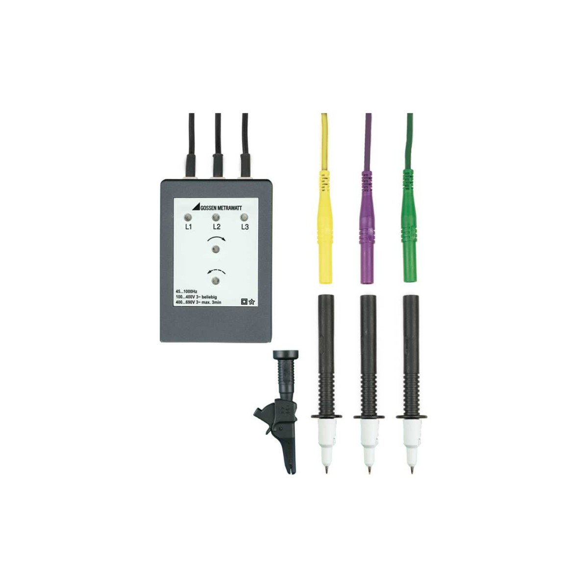 自带LED灯和接触保护插头用来测定三相系统中的相序及旋转方向,相序通过电子回路得到。1个或者2个箭头指针指示旋转方向,每一个指针都配有一个LED指示灯。每个LED指示灯分别指示相应序列是否在线,该设备可用于所有低压系统。 产品性能特点: • 符合DIN VDE 0413-7 / EN 61557-7标准,显示旋转方向和阶段 • 限定使用范围: 90 ... 660 V / 45 ... 1000 Hz 标准配置 • 相序表 • 3个带插头测量电缆 • 3个电源测试探针 • 1个鳄鱼夹 可选配件 • F801便携包 (GTY3172070P01) 技术参数