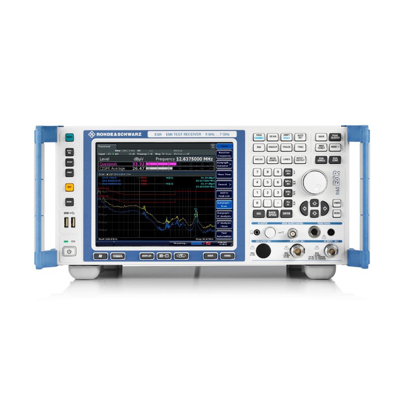 R&S®ESR EMI 测试接收机 R&S®ESR EMI 测试接收机适用于一致性测试 R&S®ESR EMI 测试接收机专用于通过传统的步进式扫描或基于 FFT 的超快时域扫描来测量电磁干扰。接收机还可以用作功能强大的信号与频谱分析仪。接收机具备实时频谱分析功能和广泛的诊断工具,能够详细分析干扰信号及其历史记录。用户可以使用这些工具检测隐藏或偶发辐射并分析成因。R&S®ESR 的易用触摸屏中配有简单直观的菜单。R&S®ESR 具有紧凑尺寸、轻量设计、可选加固外壳和可选直流电源,同样适用于移动应用。 主要特点 频率范围:10 Hz 至 3、7 或 26.5 GHz 符合 CISPR 16-1-1、ANSI C63.2、MIL‑STD‑461 和 FCC 标准 出色的动态范围和准确度 通过基于 FFT 的时域扫描实现超快速测量 支持实时频谱分析,具备 40 MHz 带宽(选件) 产品性能特点