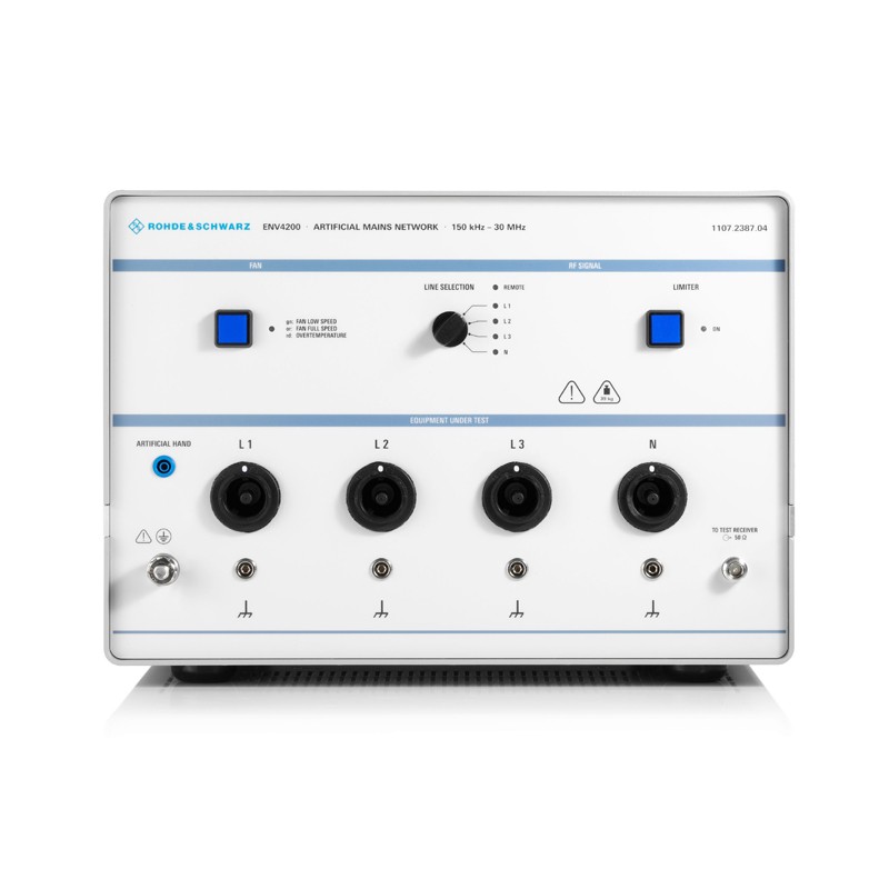 产品优势 空心电感和模拟手 空心设计和模拟手 R&S®ENV4200 200A四线制V形网络基于空心电感并含有模拟手,可在测量干扰电压时模拟用户双手的影响。 衰减器 内置10dB衰减器 为确保标准阻抗(不考虑测量接收机的输入衰减),R&S®ENV4200 200A四线制V形网络配有一个10dB衰减器。 脉冲限幅器 内置脉冲限幅器(可关闭) 内置脉冲限幅器(可停用)保护测量接收机输入兔受高能量射频干扰脉冲的影响。 温度监控 自动温度监控 机壳内部温度达到约+50℃时,R&S®ENV4200的风扇自动开启。这能够在高恒定电流负荷的情况下保护V形网络。 远程控制 TTL电平远程控制(兼容罗德与施瓦茨测量接收机) TTL控制输入通过控制器或罗德与施瓦茨测量接收机驱动,可用于在自动测试系统中远程控制相位选择。 ENV4200 技术参数