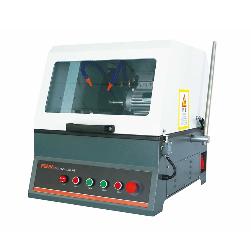 Fcut 300 手动金相切割机 Fcut 300是一款台式手动金相切割机。拥有优秀的可视性和切割能力,宽敞的工作空间,高扭矩电机,动力强,效率高,操作简单。适用于切割各种黑色金属、有色金属、热处理件、锻件、半导体、晶体、陶瓷、和岩石等样品。设备配有多种夹具,可切割不规则形状的工件,是企业和科研院校理想的切割设备。 产品特点 1. 采用全封闭结构,密封效果好,安全可靠 2. 配置高扭矩、大功率电机,切割范围与传动功率大、转动平稳、噪音小 3. 手动砍式切割,操作简单快捷 4. 侧面标配可拆卸挡板,方便进行长工件切割 5. 视窗为防爆透明工程塑料,安全可靠。视窗配有金属挡片,防止切割废削损伤视窗 6. 304不锈钢双快速夹紧夹具,耐腐蚀,寿命长 7. 304不锈钢T型槽工作台,易更换夹具,寿命长 8. 高亮度长寿命LED照明灯 9. 双气弹簧装置,平衡上罩壳重量,打开关闭上罩壳不费力 10. 专用冷却水箱,供冷却液循环使用。 11. 配置电子刹车,开启防护罩后,电机立即停止运行,进一步提高安全性 12. 内置两组可调喷水装置,降低样品烧伤风险 13. 配置高压水枪,便于清洁工作室和样品 14. 配置高端金相耗材 技术参数
