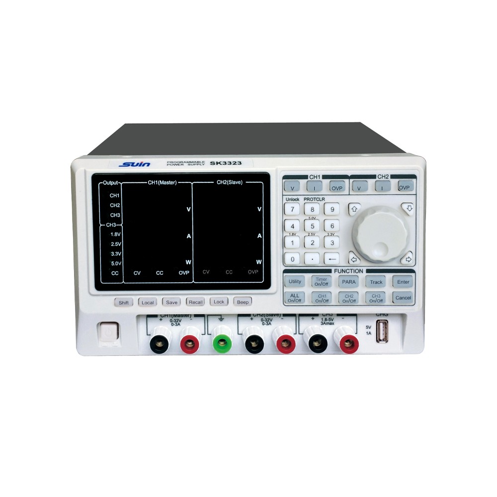 SK3323/SK3325是新一代可程控直流稳定电源。具有USB程控接口,可定时输出规定范围内的任意电压电流值:使用LED显示电源的工作状态:采用大规模集成电路:提供3路电压输出,其中1、2路稳压、稳流值步进可调,稳压稳流两种工作状态可随负载的变化自动转换,1、2路输出可串联、并联、独立工作,第3路提供了可选择的1.8V、2.5V、3.3V、5V四种输出电压,并且提供过载保护。体积小,工作可靠,使用方便。 性能特点: ● 全数字控制,低漂移 ● 10mV/1mA分辨率 ● LED数码管显示电压、电流、功率 ● 存储重现功能 ● 稳压稳流自动转换 ● 数字旋钮调节,可粗调、细调,设置方便,输出直观 ● 风扇调速 ● USB接口,5V1A,USB充电输出接口 技术参数