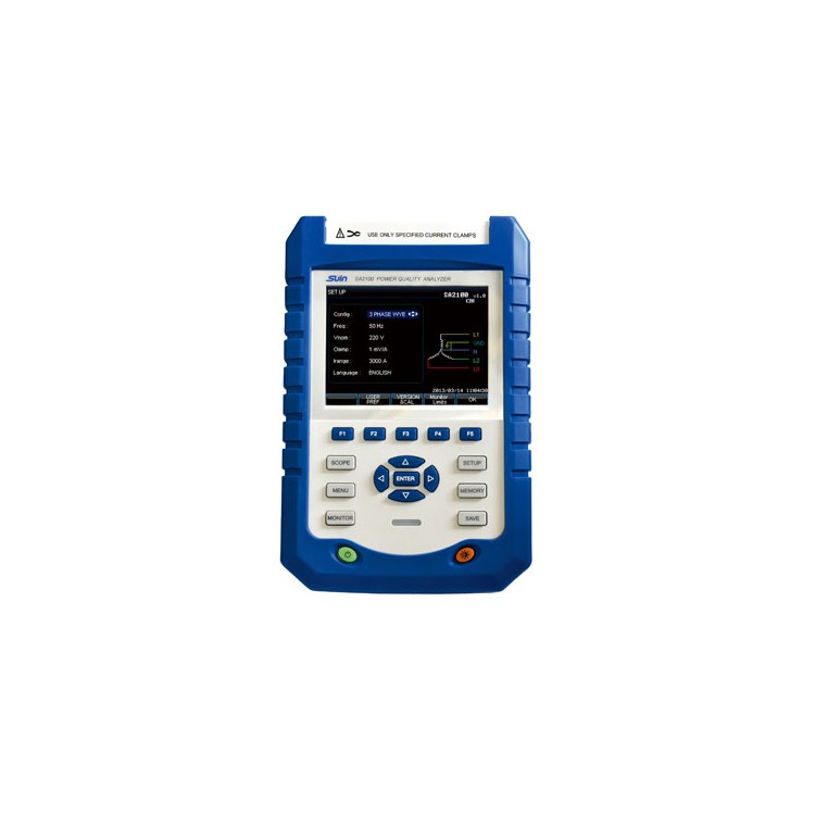 SA2100/SA2100E电能质量分析仪采用双DSP处理器架构,大规模集成电路(FPGA),嵌入式系统(uC1iux),能快速计算大量电力参数并对所有数据进行处理。专业为电力检验维护部门所设计,提供广泛且强大的测量功能来检查配电系统,能够快速便捷的检测电网质量及电气特性。大屏幕彩色液品显示界面,简单易用的键盘。 性能特点: ● 4路电压及4路电流测试输入 ● 大输入电压1000V(有效值),大测量电流5000A ● 可选择记录电能参数 ● 标配8G TF存储卡,可同时连续记录所有的电量参数达1年 ● 实时显示电压电流波形 ● 可测谐波至50次 ● 暂态波形捕获 ●浪涌电流 ● 闪变 技术参数