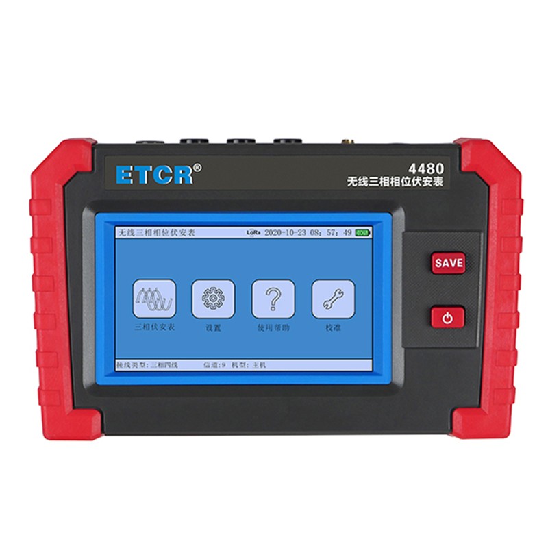 ETCR4480无线三相相位伏安表,用于变电站内不同位置的三相电力参数测量、PT无线核相、PT负荷测试、CT负荷测试、三相不平衡度测试、谐波分析等。仪表由2台手持终端、6个电流钳、2组电压测试线等组成,2台手持终端具有无线通讯及GPS通讯,可互设为主机或从机,实现同步测量变电站内不同位置之间电流、电压、相位等参数。 单台手持终端使用时,作为三相相位伏安表使用,可以测量电流、电压、相位、功率、频率、功率因素、三相不平衡度等参数及谐波分析,并且能够实时显示三相电压和三相电流的矢量图。作为负荷测试仪使用时,可以测量PT侧的电压、电流、电导、电纳、频率,CT侧的电压、电流、电阻、电抗、频率等参数。 两台手持终端同时使用时,通过无线通讯及GPS卫星授时技术,可以在变电站的不同位置同步测量六路电压幅值,相位等参数。可以进行无线PT核相。两台仪器在同时开机的情况下,能够实现联动设置接线类型、通信信道、主从机切换、时间设置等。 四台手持终端同时使用时,可将其中一台设置为主机,另三台设置为从机,特别适合多点同步测量,现场应用灵活,测试更加便捷。 ETCR4480无线三相相位伏安表采用5寸触摸彩屏、中文界面、功能直达、自动测量、操作简易快捷,准确可靠,仪表采用大容量可充电锂电池、具有数据存储、数据查阅、自动关机、USB接口数据上传导出等功能。仪表具有支持安卓系统的蓝牙通讯,安装APP后可在手机进行测试或查看测试记录。本仪器采用专用计量芯片,具备非常高的电参数测量精度,能够实时显示待测参数的变化,同时具备一键保存数据的功能。产品操作简单、使用方便、测量快速、稳定、结果可靠,是电力系统电能计量和继电保护专业,进行二次回路现场检测的新一代仪表,也广泛适用于电气设备制造、石油化工、钢铁冶金、铁路电气化、科研教学等部门。 性能特点:
