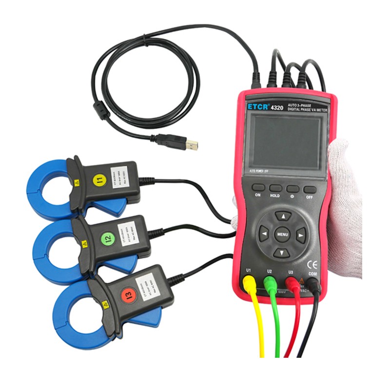 ETCR4320三相数字相位伏安表是我公司精心研制的一款专为现场测试的多功能、数字式、智能化仪表,具有高精度、高稳定、低功耗、使用方便等特点。可以在被测回路不开路的情况下,同时测量三相交流电压、电流、电压间相位、电流间相位、电压电流间相位、频率、相序、有功功率、无功功率、视在功率、功率因数、电流矢量和,判别变压器接线组别、感性、容性电路,测试二次回路和母差保护系统,读出差动保护各组CT之间的相位关系,检查电度表的接线正确与否,检修线路设备等,为用电检查人员提供一种安全、准确、便捷的新型电力仪表。伏安表配有防振、防滑、高绝缘护套采用2.8寸TFT彩色液晶屏,动态显示,向量图指示,一目了然,尽显精美豪华外观。仪表采用大口径电流钳适用于粗大导线及大电流场合的测试。三相数字相位伏安表又名智能型三相数字相位伏安表、多功能三相数字相位伏安表、三钳数字相位伏安表等,适用于电力、石化、冶金、铁路、工矿企业、科研院校、计量部门等。尤其适用于电能计费系统及继电保护系统。