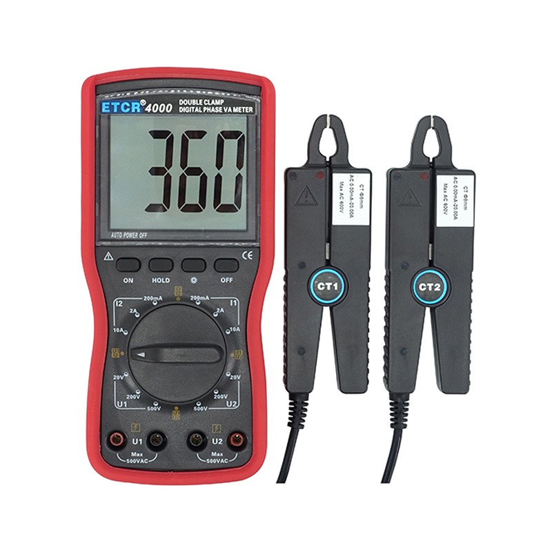 ETCR4000双钳数字相位伏安表采用超大LCD显示屏,字高达40mm,还具有白屏背光,显示一目了然,尽显精美豪华外观。