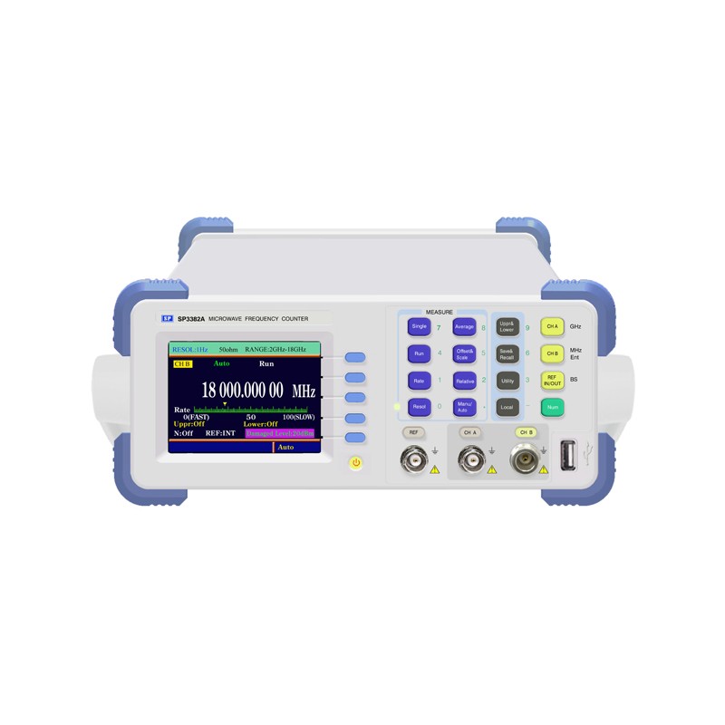 简要介绍 SP3382A系列微波频率计数器是采用微波取样技术来实现对微波的测量,整个测量过程的功能控制、测量时序和数据处理均由机内微处理器来完成,它是新一代的智能化微波测频仪器。本仪器采用了中大规模集成电路和一些性能优异的单片集成电路,使仪器的设计更加合理,功耗小,可靠性高,整机平均无故障时间大于8000小时。本仪器具有测频范围宽、灵敏度高、动态范围大、精度高、使用方便等特点,满足了国防、科研、电子产品生产等领域对微波频率测量的要求。 产品特点 该仪器线路和结构设计合理,紧凑,功耗小,可靠性高,整机平均无故障工作时间大于8000小时 具有测频范围宽,灵敏度高,动态范围大,精度高,速度快,体积小,使用灵话方便,性能价格比高等特点 导电橡胶工艺的使用,使仪器更加美观大方结构更合理,使用更便利 采用3.5寸QVGA彩色液晶显示技术,各测量参数,数据一目了然,使用寿命长 具有手动模式快速测量 低频量程有10位的高分辨率测量方式 智能化接口,该仪器配RS232接口(可选配USB,GP-IB接口),实现与计算机连接与管理,并可进行远程控制,形成自动化测试系统,实现无人监控,以满足不同用户的使用需求。 技术指标