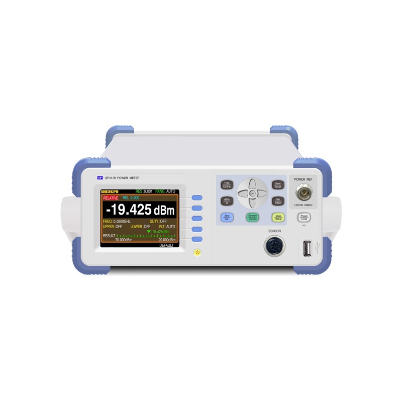 简要介绍 SP4418型微波功率计是一种单通道、 可程控高性能功率计, 配8480系列功率计探头,可对不同频率、功率的微波信号进行高精度的平均功率测量。本仪器采用高亮度彩色液晶显示屏,读数清晰、亮度高、寿命长。该机具有功耗低、体积小、重量轻等特点。仪器测量功率时既可以选择自动测量量程也可以选择手动测量量程。该仪器是生产车间和实验室微波计量和测试的必备仪器。该仪器测量的稳定性好、分辨率高、重复性好,可用计量信号源输出功率的误差和准确性,也可用于自动测试系统中测试微波功率,以及测试放大器输出功率,衰减器的衰减量等等。 产品特点 相对测量 偏移测量 极限测量 可输入频率选择修正值 可选配USB或IEEE-488接口 具有程控功能 可量程设置 读出测量数据 具备调零、校准功能 高可靠性,平均无故障工作时间≥20000小时 表面贴装片工艺生产,新型金属机箱 中/英文菜单,方便使用 技术指标