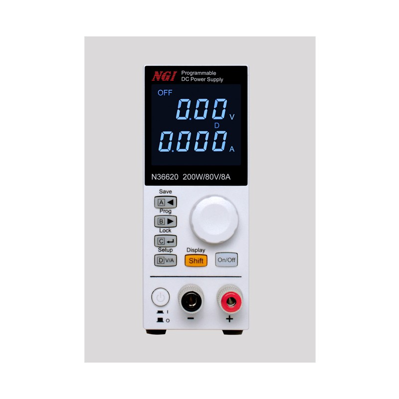 产品特点 单机输出:200W/80V/8A、100W/80V/6A 单台电源仅1.8kg,体积小巧,方便携带 宽范围输出,一台可当多台使用 支持过压/过流/过温等保护功能 支持Sense补偿、外部触发 支持100~240VAC宽范围交流输入 最大内置4×100组电压和电流数据 标配RS232、RS485、LAN 支持SCPI指令集和MODBUS-RTU协议 可选配4U标准机框构成8路电源 功能与优势 超宽范围设计,以一抵多,节省用户前期投资 N36600系列直流电源采用宽范围设计,以N36610-80-05型号为例,电源输出功率为100W,最大输出电压和输出电流分别可达80V和5A,可替代传统80V×1.2A / 60V×1.6A / 32V×3A /16V×6A四种机型,减少用户前期投资成本和使用空间。
