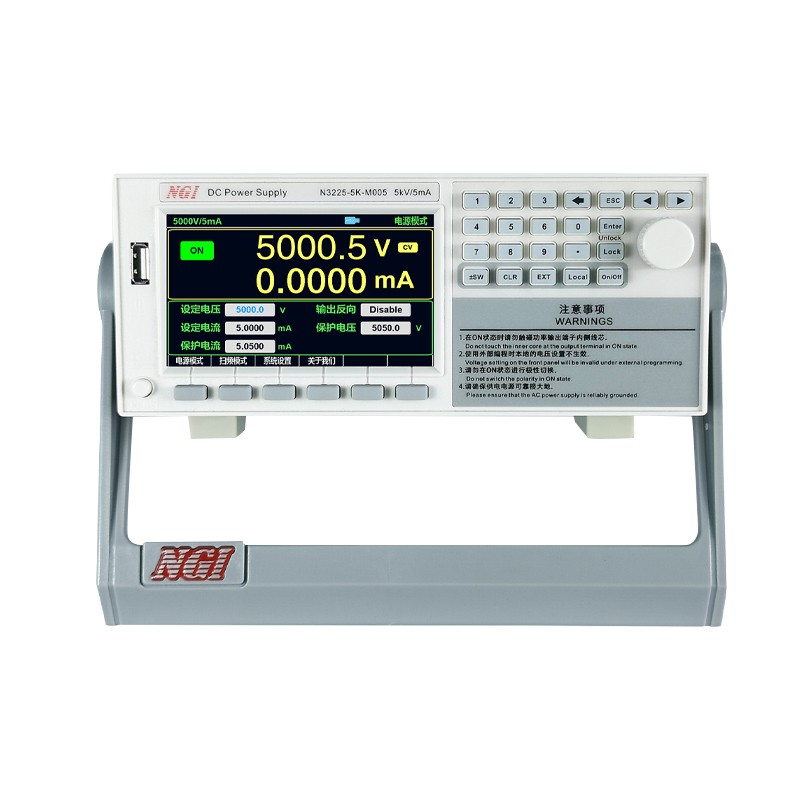 性能特点 ■ 电源输出电压±2.5kV、±5kV、±10kV ■ 电压/电流最小测量分辨率0.1V/0.1μA ■ 通信支持LAN、RS232,支持SCPI指令 ■ 4.3英寸高清彩屏,操作界面简洁大方,方便易用 ■ 低噪音,适合高精密源和高灵敏度测量 ■ 具备高压输出接口、模拟编程接口、电流监控接口 ■ 具备跳闸电压电流报警提醒 ■ OVP/OCP/OTP多重保护 功能与优势 低输出噪音 NGI在测试仪器行业有着非常丰富的电源研发经验,在N3200系列高压直流电源的设计上表现十分亮眼。低输出噪声对电源来说至关重要,N3200系列高压源最大输出电压纹波低于3mVrms,这对高灵敏度测量仪器进行漏电流或高阻测量时非常有利。