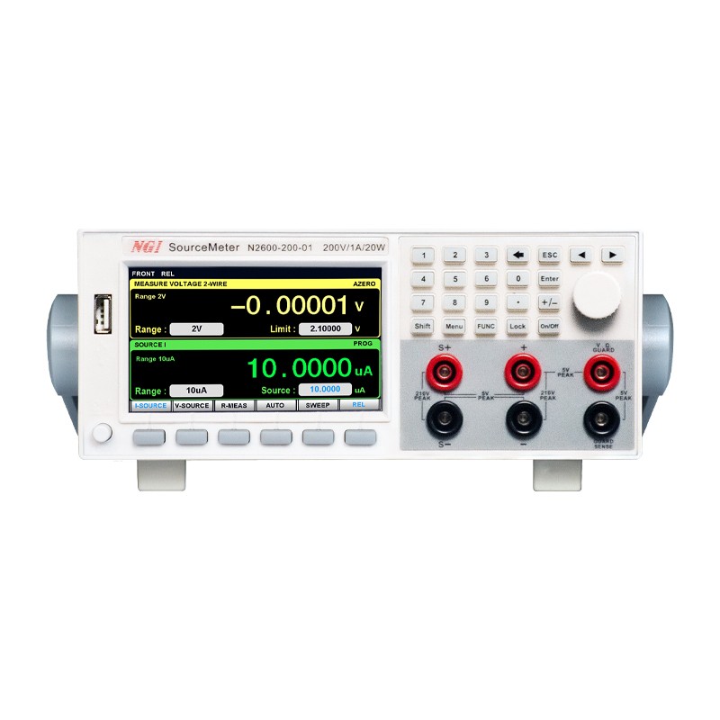自动化以提高生产测试效率 N2600系列数字源表能在提供超高精度电压源和电流源的同时进行高精度测量,无需更改连接或使用其他设备,极大地提高了生产测试效率。同时为满足生产应用所需的吞吐率要求,数字源表具有许多内建功能,能运行复杂的测试序列,无需速度较低的计算机控制或GPIB通信。 大尺寸LCD高清显示屏 N2600系列数字源表配有4.3英寸LCD高清显示屏,相比传统VFD显示板,LCD高清液晶显示屏具有耗电量低、体积小、辐射低等优点,结合专业化界面设计,操作简单,测量内容显示更加直观、全面。
